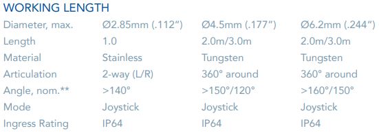 探头直径选项范围为ø2.85mm(.112”)至ø6.2mm(.244”),工作长度为1.5m(4.9')至3m(9.8'),耐用的编织探头可提供最大的运动范围和可见性。